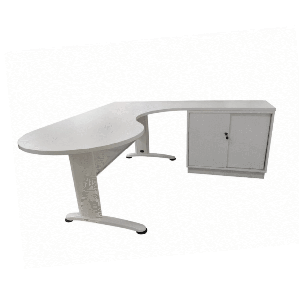 Sleek, modern L-shaped attached cabinet director desk is designed for functionality and style, it features a spacious white tabletop with a clean, minimalist look, providing ample room for work essentials…