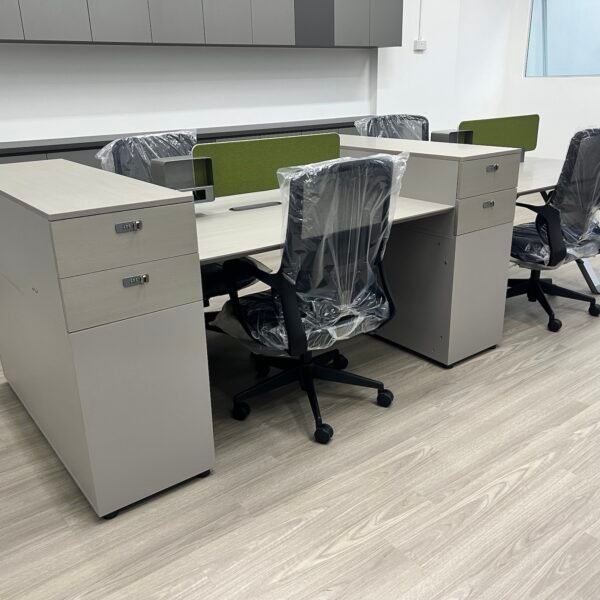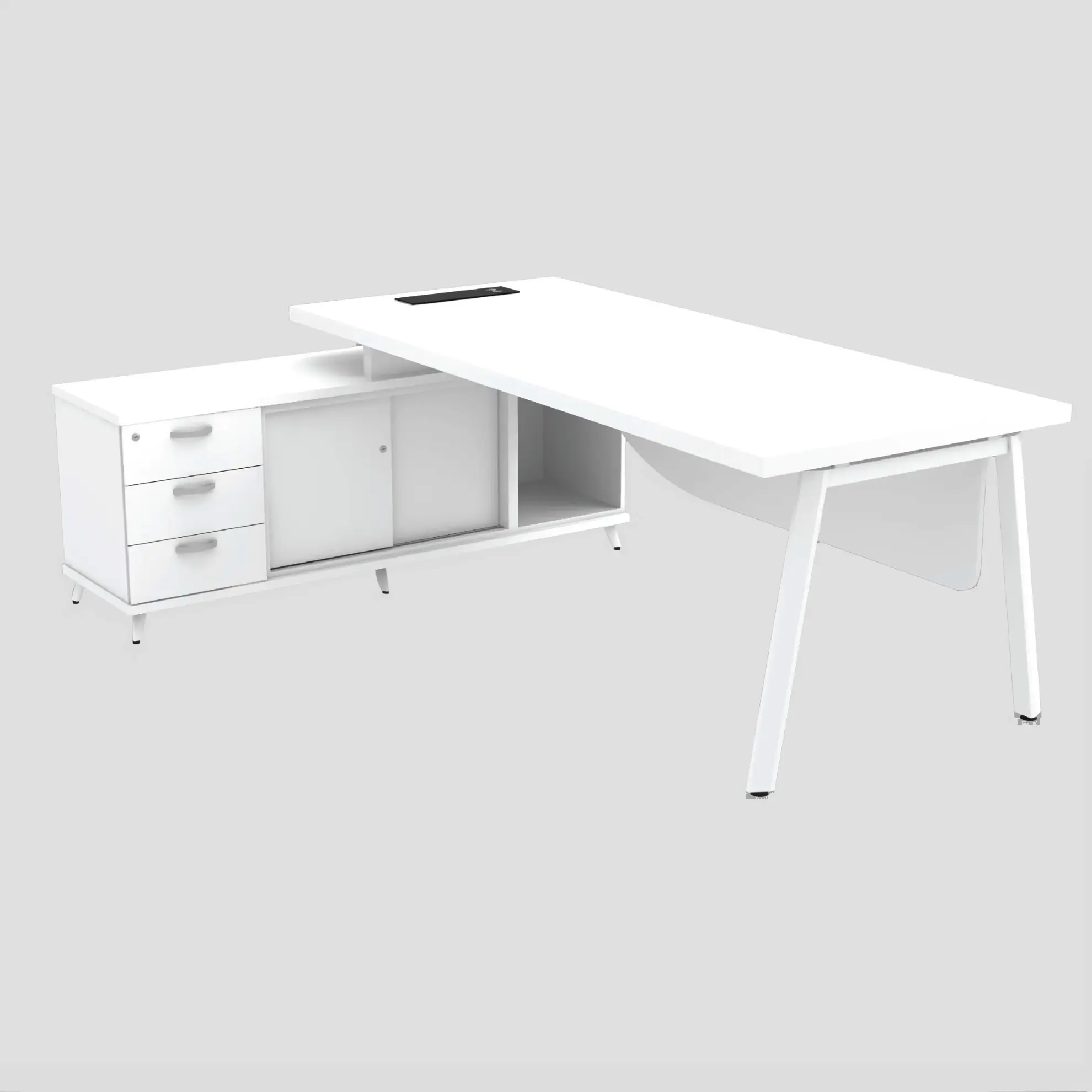 Sleek, modern L-shaped attached cabinet director desk is designed for functionality and style, it features a spacious white tabletop with a clean, minimalist look, providing ample room for work essentials such as a computer, documents, and stationery.